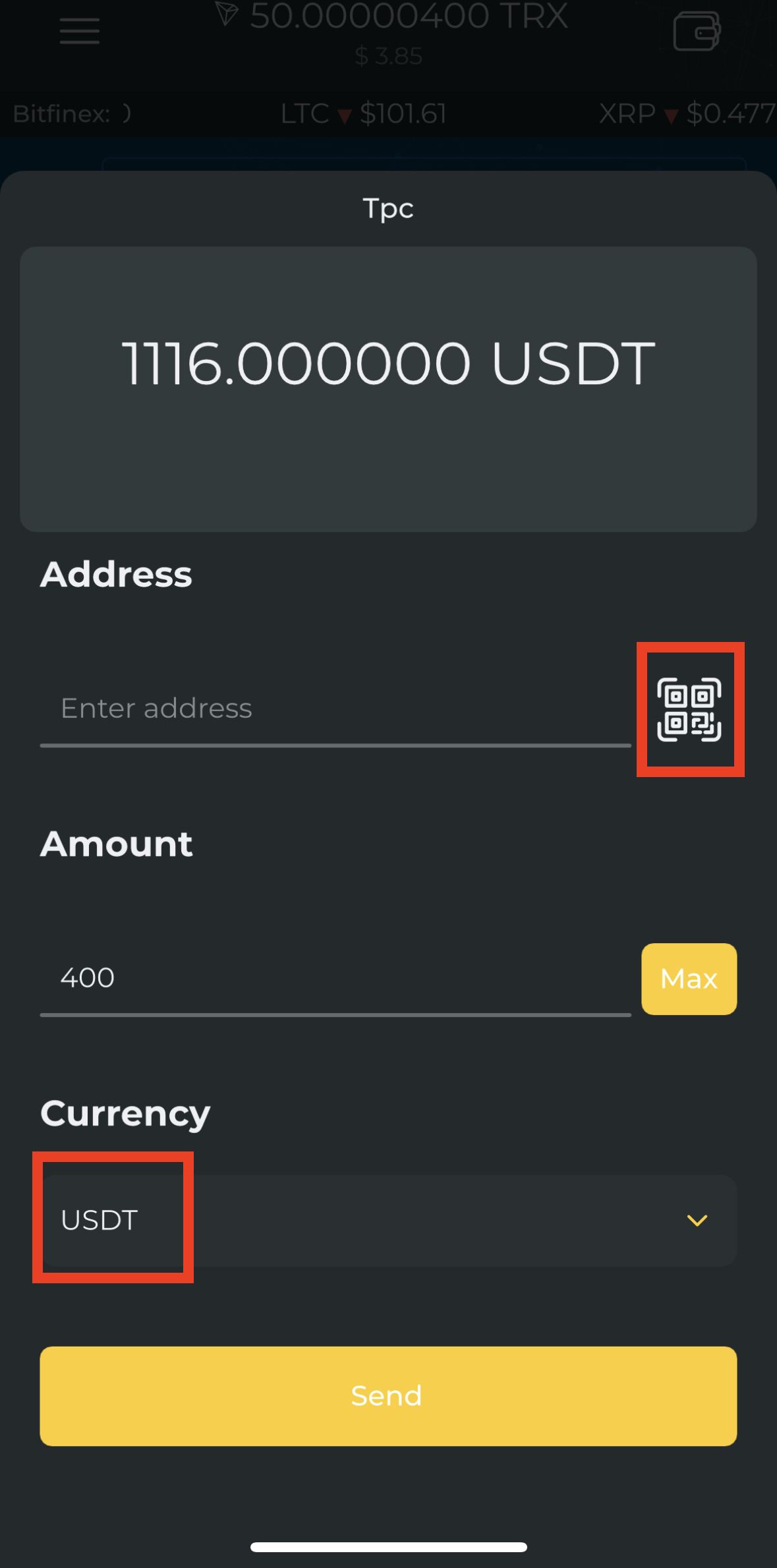 On the right side, select the QR code scanner and scan the QR code on the website or paste the copied payment address and click the button Send